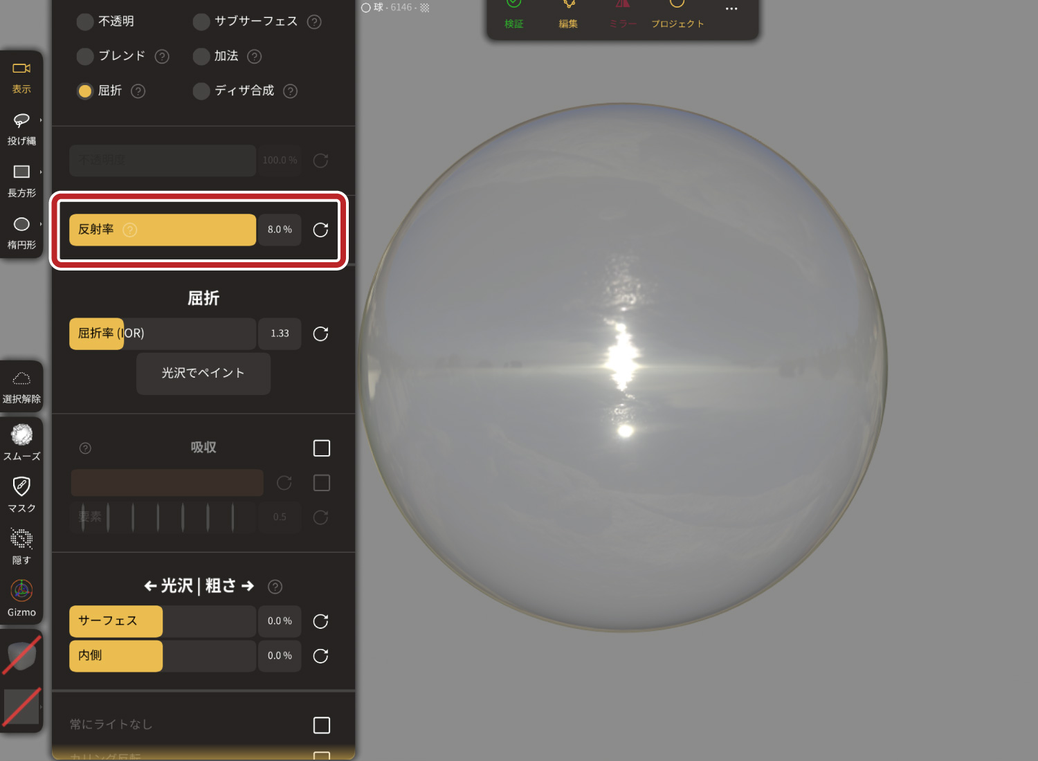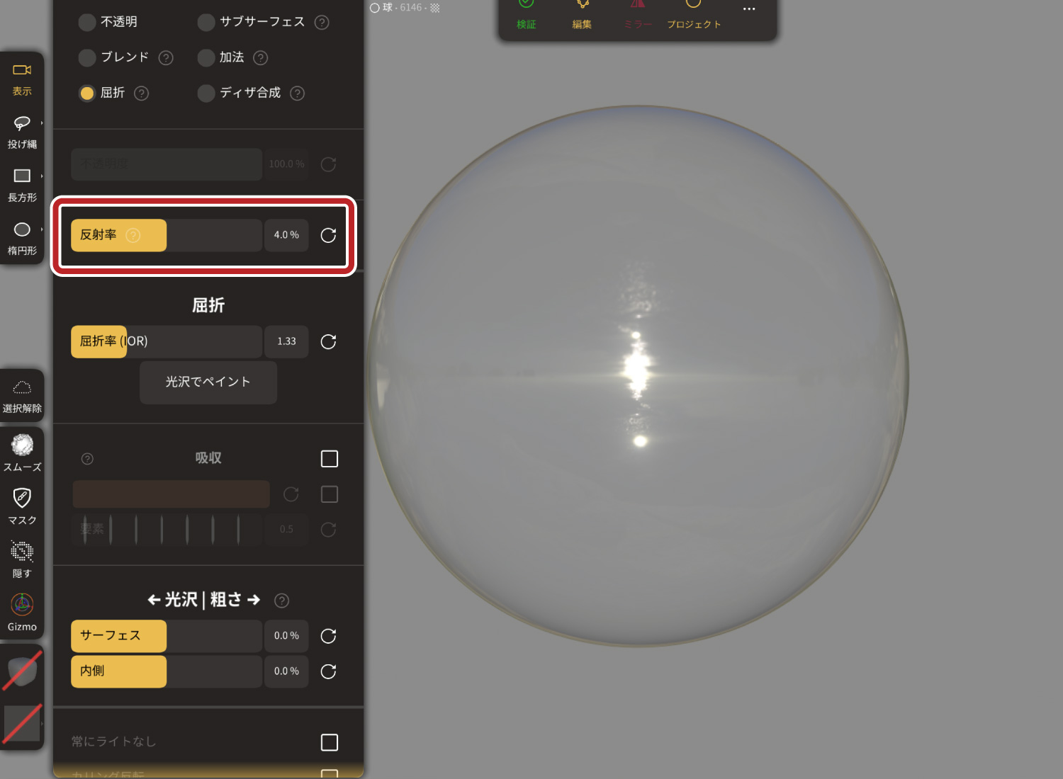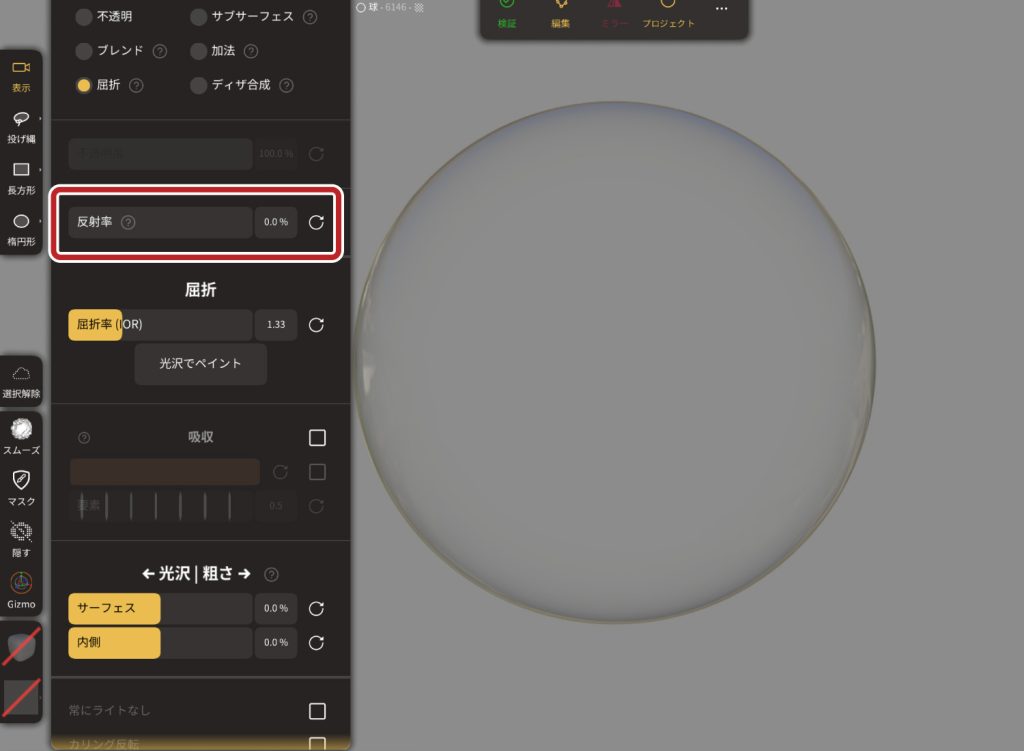 透明マテリアルの反射率を調整できます。