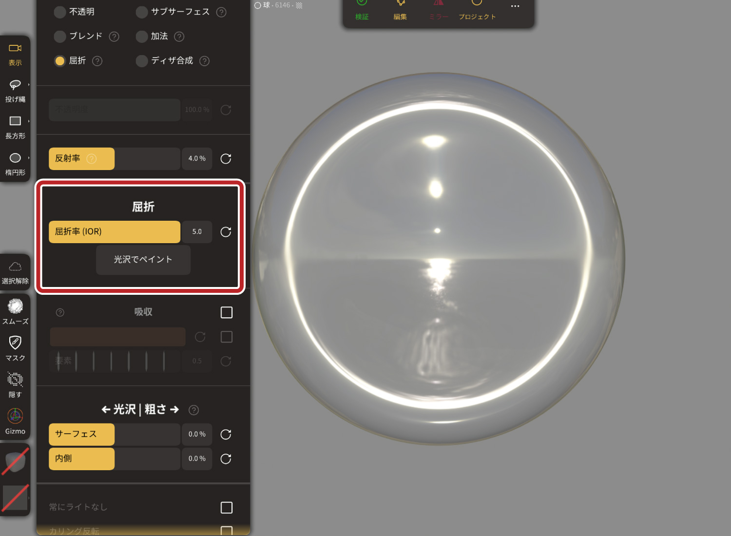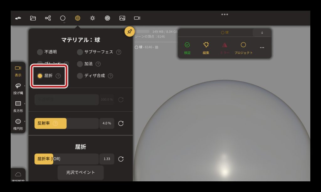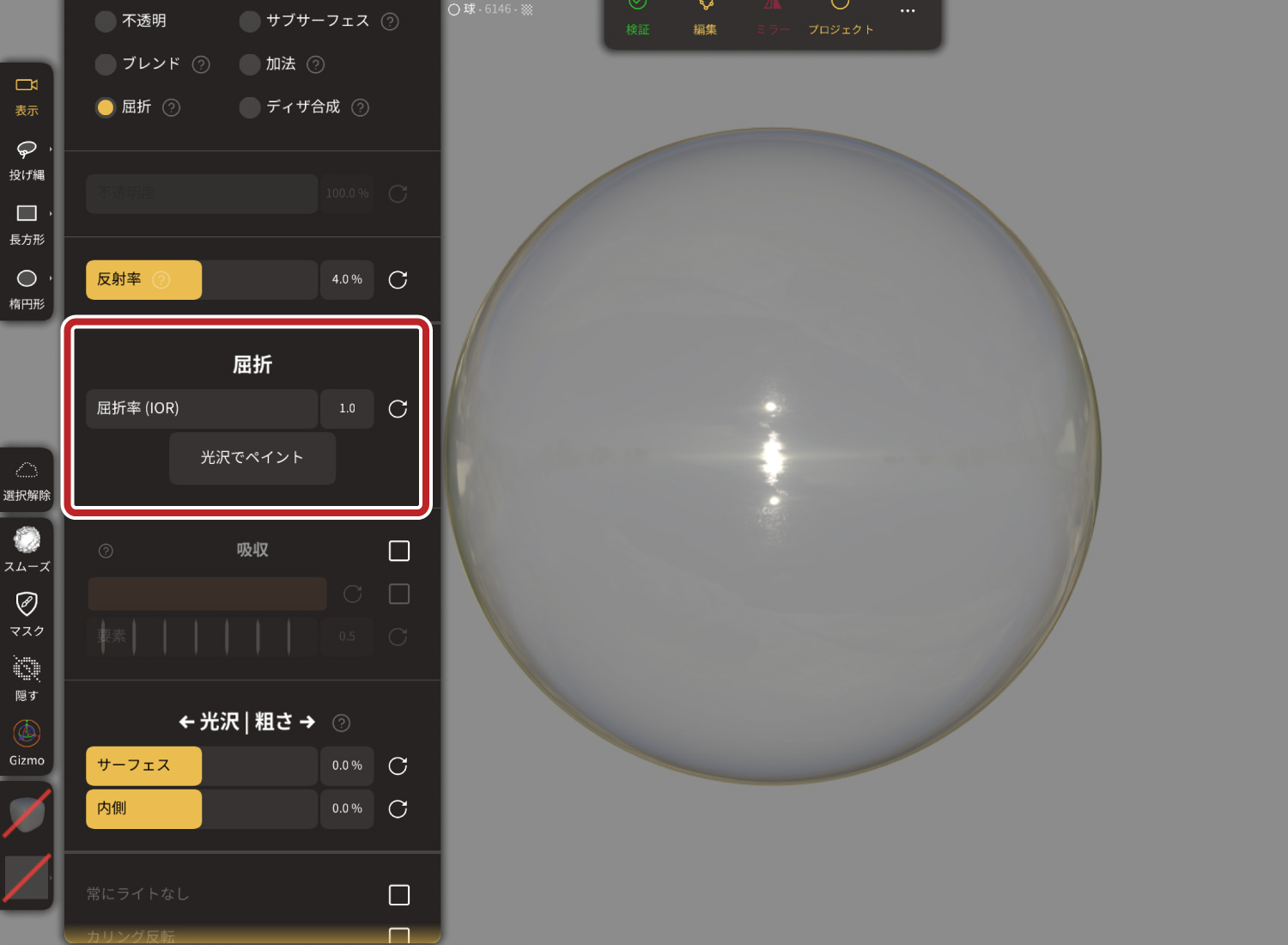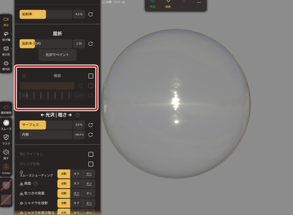透明マテリアルの反射率を調整できます。