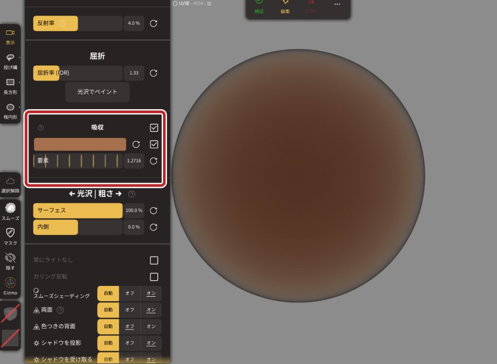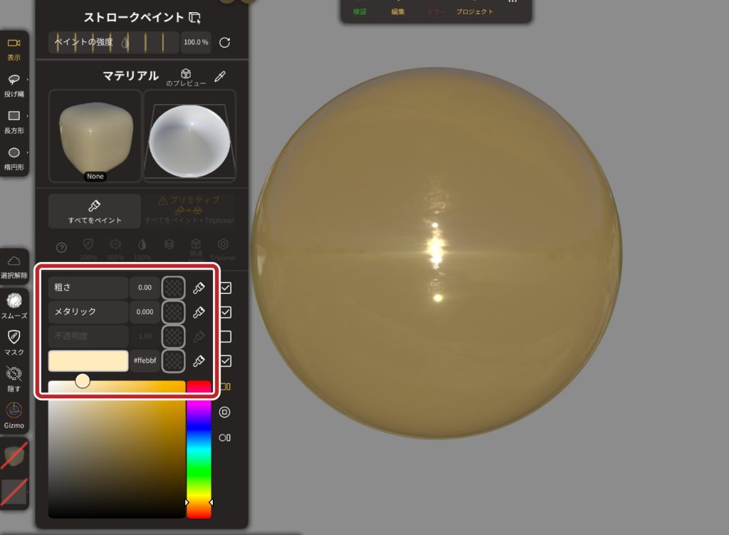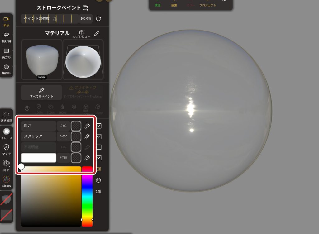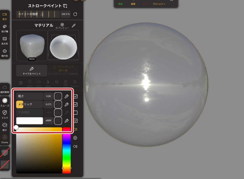 ここでは「粗さ」、「メタリック」、「色」などの調整が可能です。