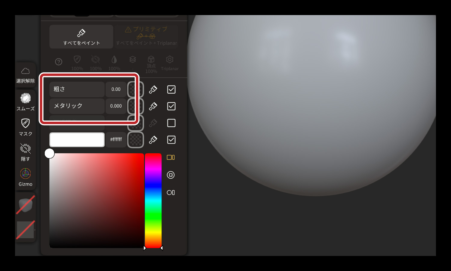 「メタリック」は数値が低ければ低いほどオブジェクトが発光します。