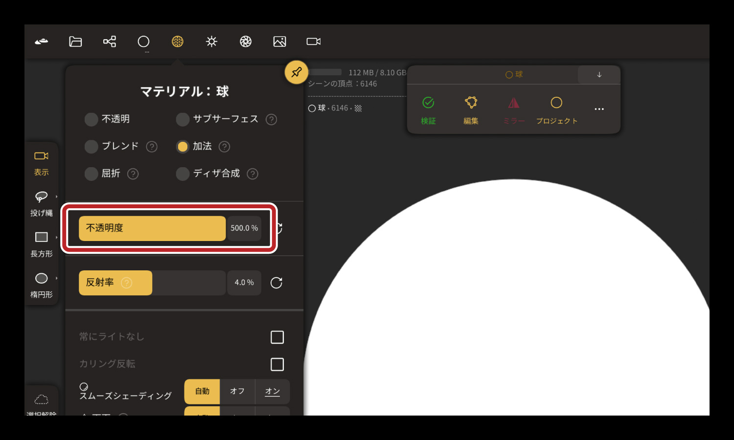 マテリアルの不透明度の調整ができ、不透明度を100.0%の値よりも上げるとオブジェクトがより明るくなります。主に「ポストプロセス」の「ブルーム」と合わせて使用することにより、オブジェクトを発光させることができます。